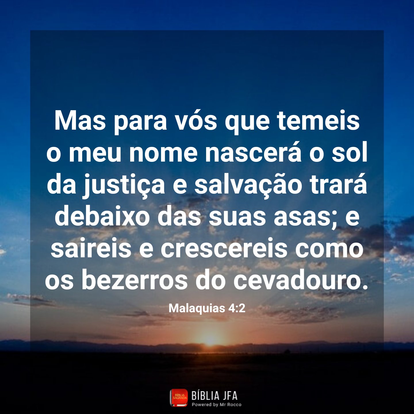 Para os salvos haverá vida eterna e bênção. Malaquias 4 O Sol da Justiça e Seu Precursor. Quem nele crê pode alegrar-se. E saireis e saltareis como bezerros da estrebaria. 5 Entrega o teu caminho ao SENHOR confia nele e o mais Ele fará. Aquele que dá testemunho destas coisas diz. A promessa de salvação é também sinônimo de cura através dos. Todavia para vós todos quantos amam reverentemente o meu Nome nascerá o sol da justiça trazendo cura em suas asas. O tempo da estrela da manhã acabou e nada resta escondido.